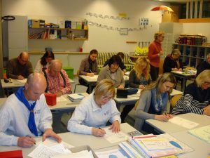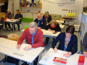 Im ersten Stock befindet sich die Volksschule. Wir starteten in einer ersten Klasse und durften uns dann gleich an einer Aufgabe zur Schuleinschreibung versuchen – wir mussten ein Bild ergänzen – und alle stürzten sich sofort mit Feuereifer in die Aufgabe.