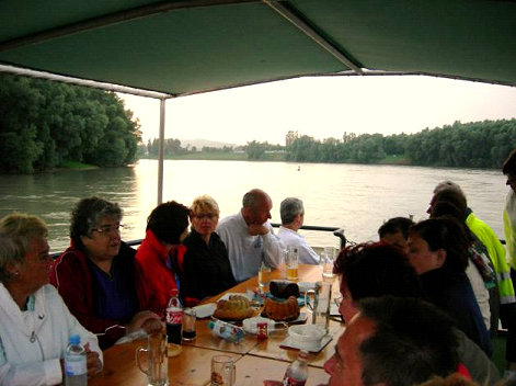 Die Fahrt ging stromauf bis Ottensheim, wobei uns eine starke Strömung ein klein wenig zu schaffen machte, dafür aber ging es flott wieder zurück. Der zweite Kapitän Manfred brachte uns sicher wieder zum Liegeplatz. Leider wurde es kühler und Regen setzte ein, so dass wir es uns unter Deck gemütlich machten. Aus dem geplanten Lagerfeuer wurde auch nichts.