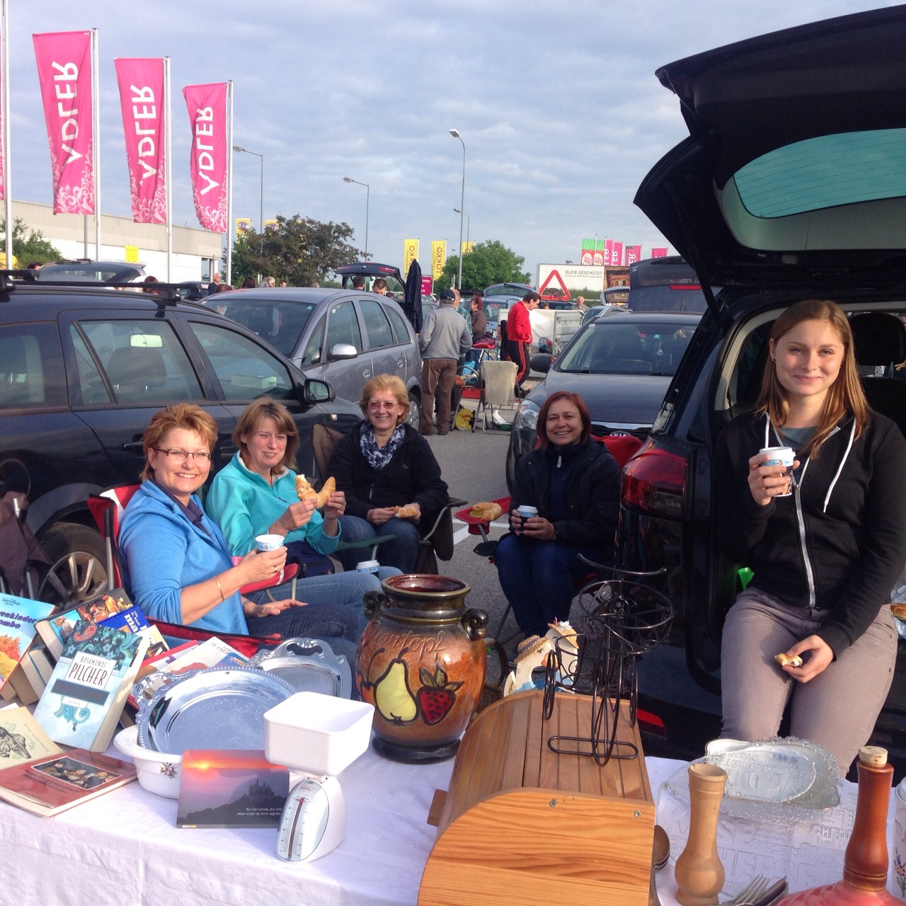 Um 3:15 Uhr früh fuhren 5 hochmotivierte, aber völlig unerfahrene Flohmarktverkäuferinnen (Julia, Anna, Margit, Irene, Ulli) Richtung Ansfelden zum Adler Flohmarkt. Bei absoluter Dunkelheit, aber schon umgeben von vielen anderen Standlern, begannen wir unseren Stand aufzubauen und versuchten unsere Bücher und diverses Krismskrams möglichst optimal zu präsentieren.