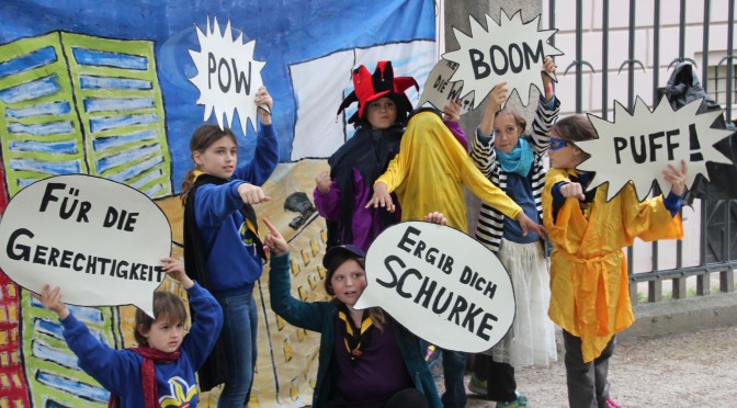 Die „Superhelden“ führten uns ein Rollenspiel vor, in dem sie uns erzählten, dass Professor Brutus beim Ausprobieren der Kräfteverstärkerungsmaschine zu Brutalus wurde. Die Superhelden baten uns um Hilfe. Wir mussten Teile für die Maschine finden um sie zu reparieren.