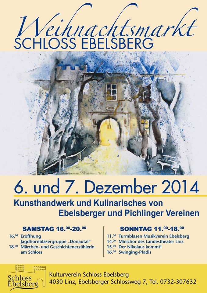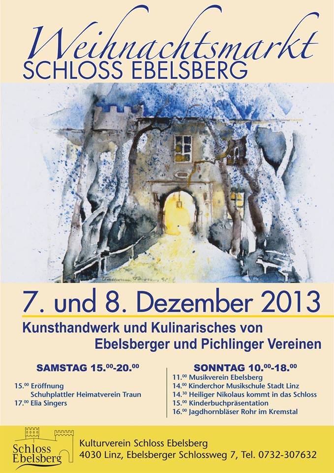Auch heuer findet wieder der Weihnachtsmarkt im Schloss Ebelsberg statt – diesmal als Neuerung zweitägig. Am Samstag 7. Dezember 2013 von 15:00 bis 20:00 Uhr und am Sonntag 8. Dezember 2013 von 10:00 bis 18: Uhr bietet der Markt Handwerk und Kulinarisches von Ebelsberger und Pichlinger Vereinen.